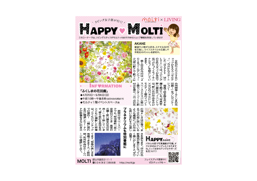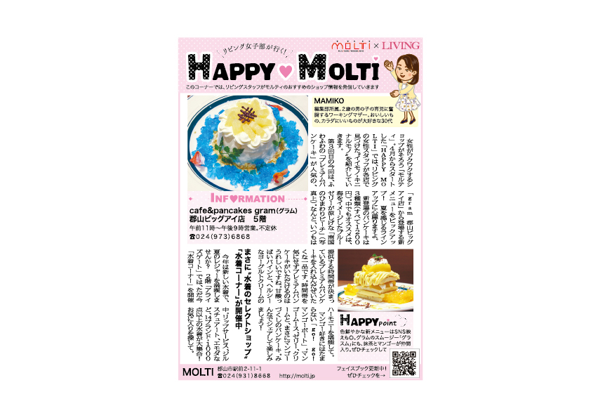 『HAPPY MOLTI』というコラムを連載したことがありました。記事を書いている人に、実際にMOLTI内の各店舗でさまざまな体験をしてもらい、それを記事型広告で掲載していました。生活者の目線に立って良いと思ったことを記事にしてくたので、読者の方が読み物として楽しみなが共感してくれる広告になったと感じています。顔が見える記者の方がいて、その特徴を活かした提案をしてくれるのはリビングならでは